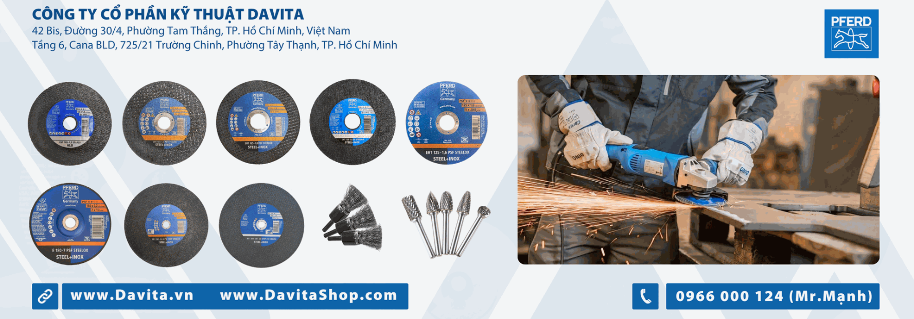 Sản phẩm: Đá mài, đá cắt cao cấp, đĩa mài mềm hạt sứ Ceramic (Victograin của PFERD, Actirox của VSM và AF799 của SIA), mũi doa kim loại, đá nhám xếp đến từ hãng PFERD (Đức) với hơn 200 năm kinh nghiệm và chất lượng vượt trội, tiết kiệm thời gian chi phí sản xuất nhưng an toàn tuyệt đối cho người sử dụng trong ngành gia công Kết cấu kim loại